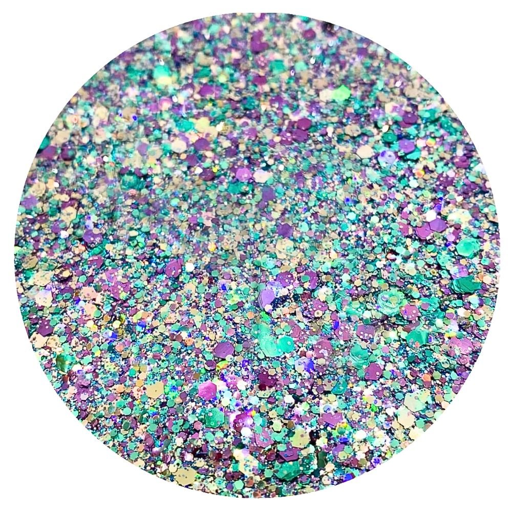 - Form: hexagon | Mix: kombinerar Classic Sparkles, Iridescent Shimmers och holografiskt silver (endast silverflagorna är holo).